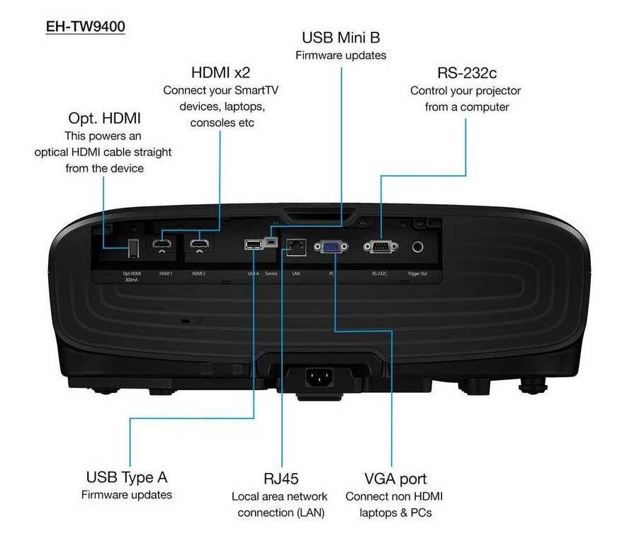 The Epson EH-TW9400 projector offers versatile connectivity, including two HDMI ports supporting HDCP 2.2 for 4K content, USB for firmware